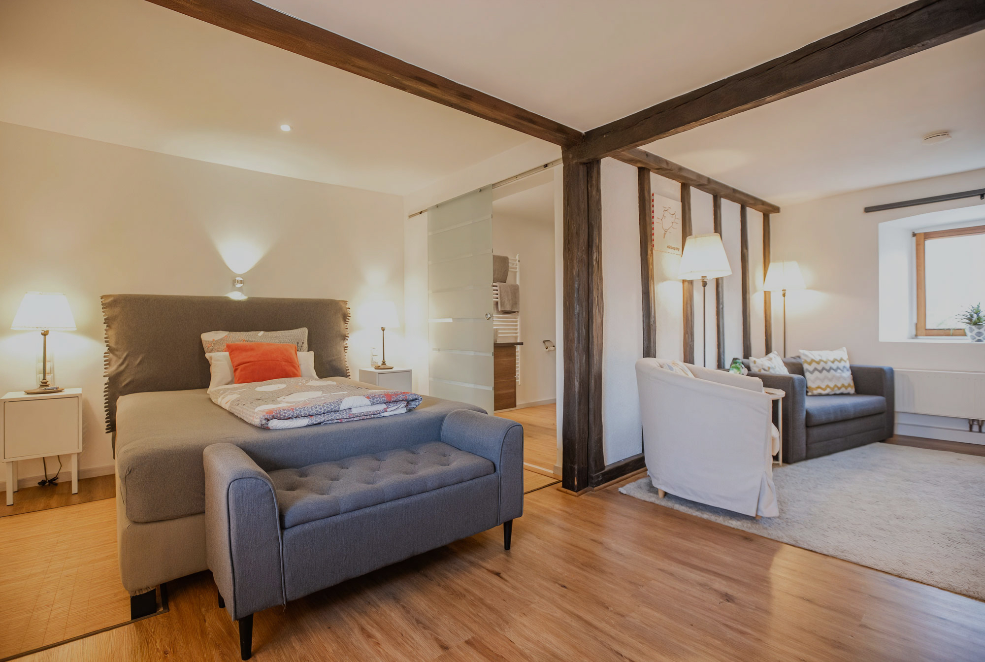 Buche jetzt Dein „Deluxe Double Room“ in der Pension Schwedenkreuz mit gemütlicher Sitzecke, Schreibtisch und Badezimmer und 20 m².